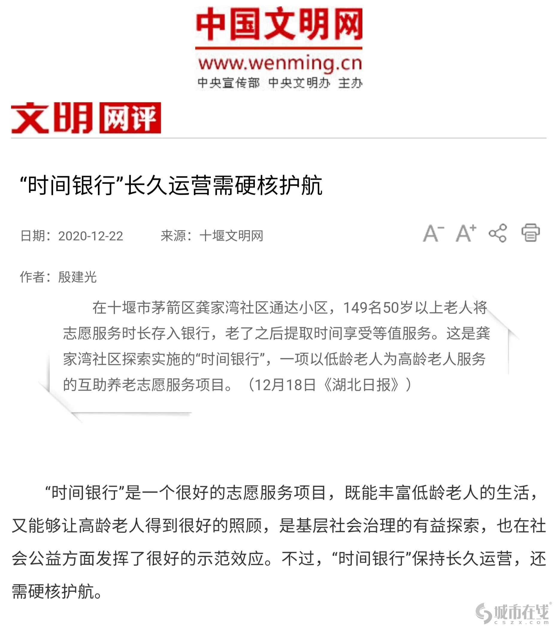 “时间银行”是一个很好的志愿服务项目,既能丰富低龄老人的生活,又能够让高龄老人得到很好的照顾,是基层社会治理的有益探索,也在社会公益方面发挥了很好的示范效应。不过,“时间银行”保持长久运营,还需硬核护航。