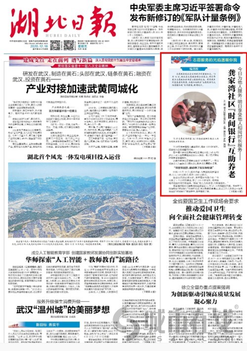 在十堰市茅箭区龚家湾社区通达小区,149名50岁以上老人将志愿服务时长存入银行,老了之后提取时间享受等值服务。这是龚家湾社区探索实施的“时间银行”,一项以低龄老人为高龄老人服务的互助养老志愿服务项目。(12月18日《湖北日报》)
