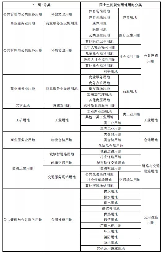 《土地利用现状分类》国家标准采用一级、二级两个层次的分类体系,共分12个一级类、57个二级类。其中一级类包括:耕地、园地、林地、草地、商服用地、工矿仓储用地、住宅用地、公共管理与公共服务用地、特殊用地、交通运输用地、水域及水利设施用地、其他土地。《中华人民共和国土地管理法》与《土地利用现状分类》中类别的对照关系如下表: